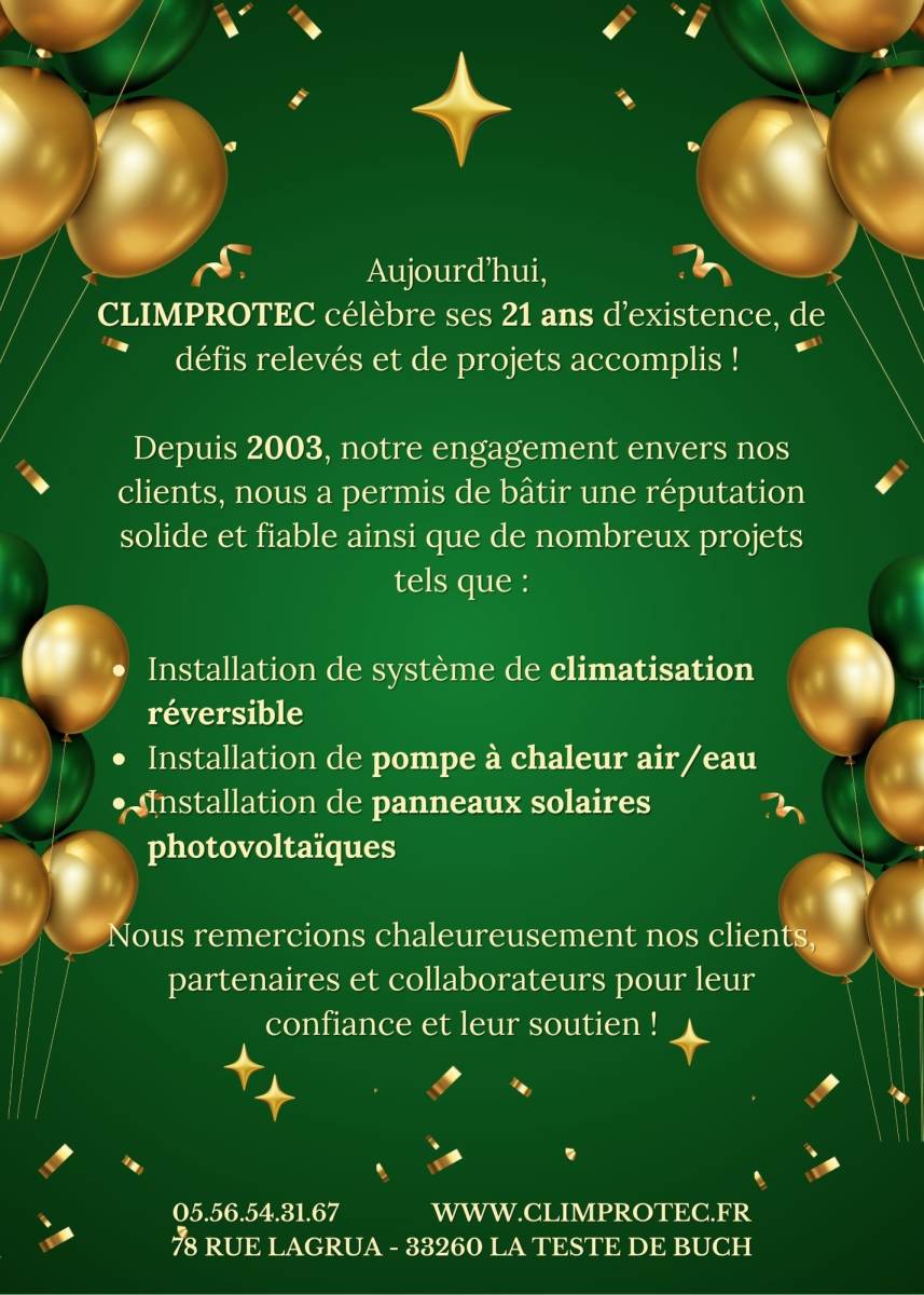 Depuis 2003, CLIMPROTEC, située à La Teste-de-Buch, s’impose comme un acteur incontournable dans le domaine de la climatisation réversible, des pompes à chaleur et des panneaux photovoltaïques.