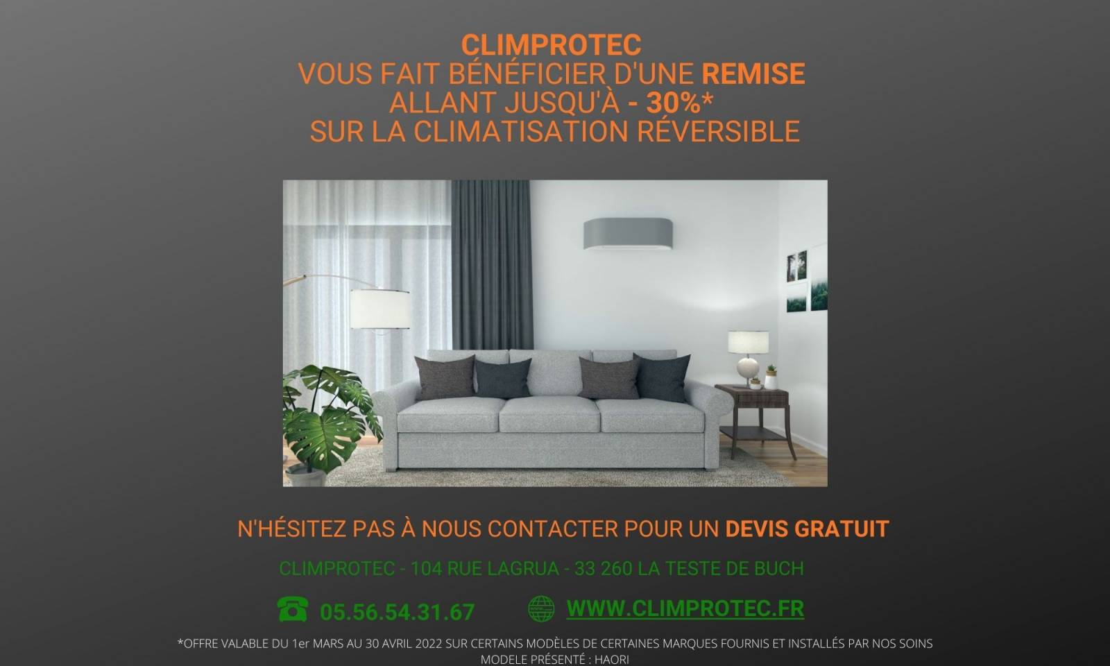 Du 1er mai au 30 juin 2022 CLIMPROTEC à La teste de Buch sur le Bassin d'Arcachon vous fait bénéficier d'une remise allant jusqu'à 30% sur les pompes à chaleur air/air, climatisation réversible de type split ou multi split.